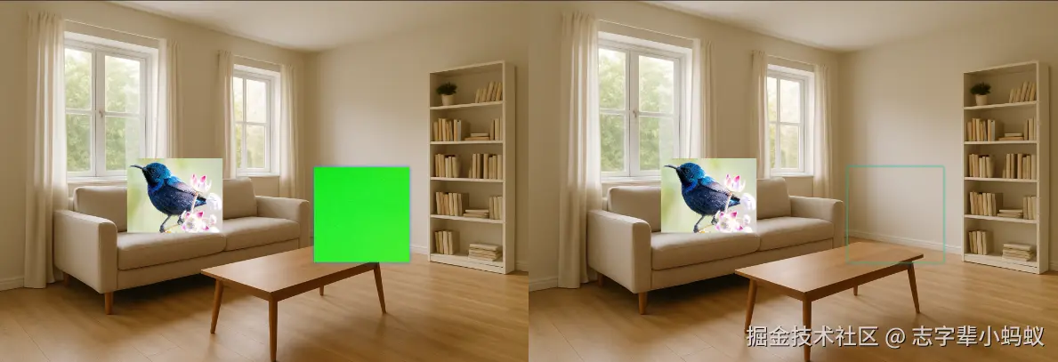 - 这样,前景图像中掩模标识的区域(绿色区域)就被背景图像中的相应区域替换,创造隐形效果。